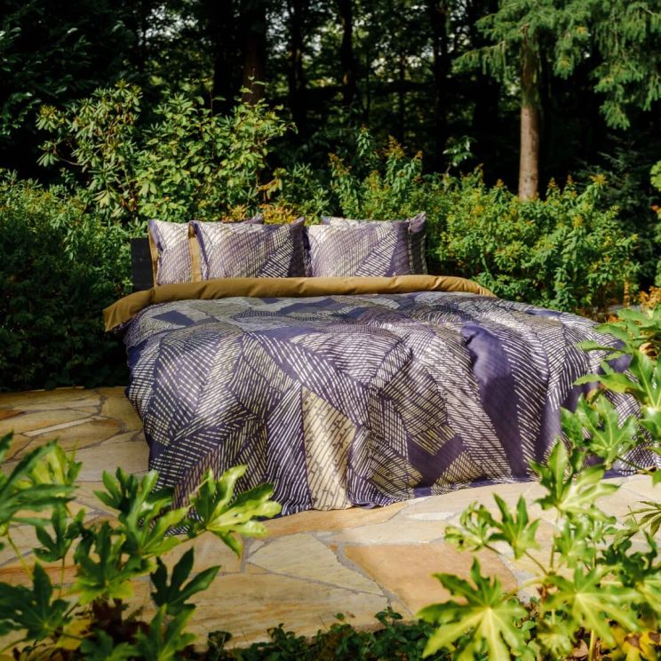 Dekbedovertrek Kymani heeft een drukker patroon met witte en gouden strepen op een paars/blauwe achtergrond. Door de donkere achtergrondkleur vallen de strepen extra goed op. De uni kleur aan de achterkant van het overtrek is goud.