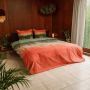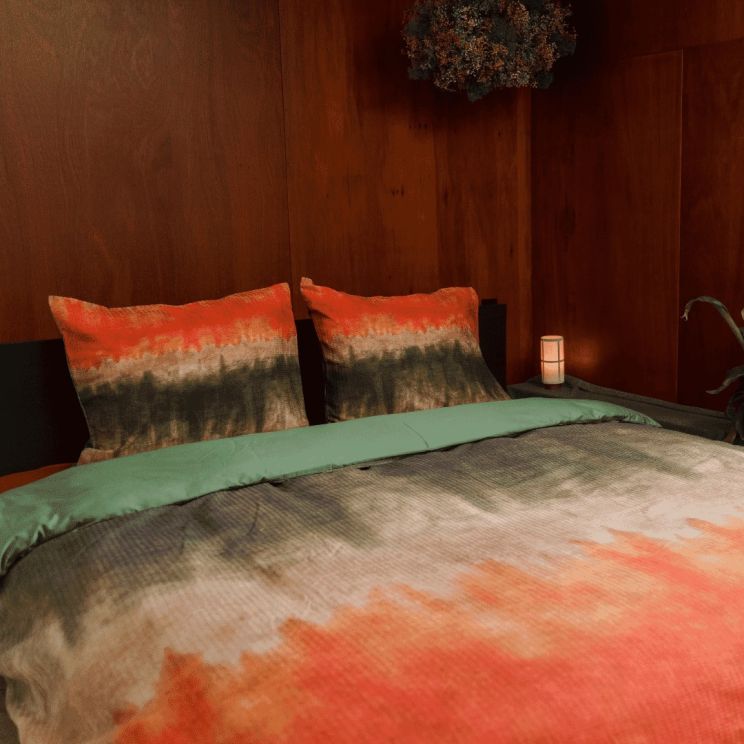 Het Yuzu dekbedovertrek heeft een tie-dye sfeer door de levensechte 3D print. De print heeft zacht rode en oranje tinten gecombineerd met turqoise. Het dessin is geprint op een mooie katoenen wafel pique, een stof met een zachte wafelstructuur.
