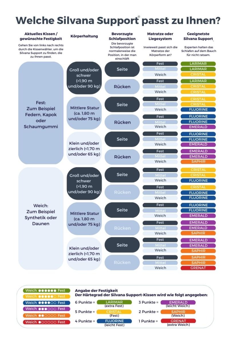 Scrollen Sie auf dieser Seite nach unten, um einen Überblick über die Spezifikationen aller 6 Silvana Support Modelle zu erhalten. Wenn Sie immer noch Schwierigkeiten haben, Ihre Wahl zu treffen, kann Ihnen vielleicht der Silvana Support Kissenauswahl weiterhelfen.