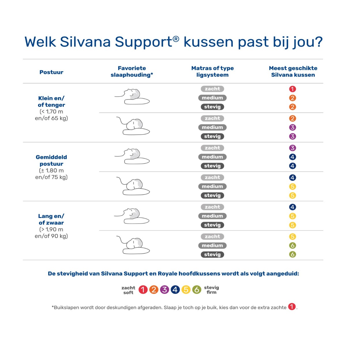 Das meistverkaufte Nackenstützkissen Silvana Support Kissen mit Nackenstütze. Seit über 30 Jahren ein unbestrittenes und bewährtes Nackenstützkissen. Entwickelt in Zusammenarbeit mit und empfohlen von Physiotherapeuten. Das Silvana Support Nackenstützkissen ist in 6 verschiedenen Ausführungen erhältlich, von extrem weich bis perfekt hart. Das Silvana Support Nackenstützkissen ist aus den besten Materialien gefertigt und bis ins kleinste Detail durchdacht, um Ihren Nacken optimal zu stützen. Für Bauch-, Rücken- und Seitenschläfer ist ein Silvana Support Nackenstützkissen erhältlich. Das Silvana Support Royal Nackenstützkissen ist die luxuriösere Version. Das gleiche Modell, jedoch mit Daunenfüllung. Das Silvana Comfort Kissen ist die günstigste Variante und kommt ohne die Latex-Nackenstütze.