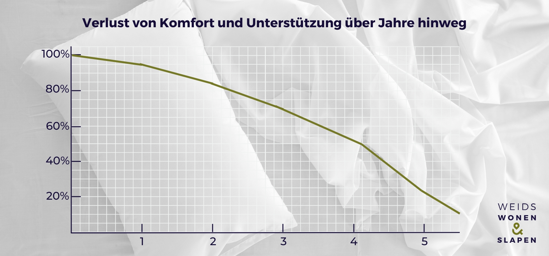 Ein gut stützendes Kissen trägt zu einem erholsamen Schlaf bei und beugt Nacken- und Schulterbeschwerden vor. Der Komfort- und Haltverlust im Laufe der Jahre ist allmählich, was es schwierig macht, festzustellen, wann Ihr Kissen ausgetauscht werden muss. Tatsächlich ist unsere Erfahrung, dass Kunden bei deutlichen Nacken- oder Schulterbeschwerden eher einen Besuch beim Physiotherapeuten vereinbaren, als sich zu fragen, ob ihr Kissen (noch) die richtige Unterstützung bietet.