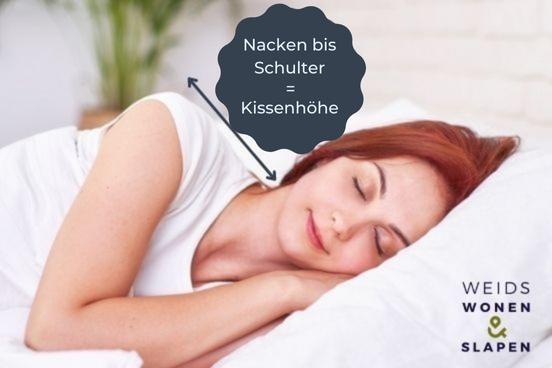 Sind Sie Rücken- oder Seitenschläfer? Oder schläfst du hauptsächlich auf dem Bauch? Das Ausmaß, in dem Ihre Schulter in Ihre Matratze einsinkt, ist ein wichtiger Faktor, den Sie berücksichtigen sollten. Ein Seitenschlafkissen ist oft ein etwas dickeres Kissen als das Kissen für Rücken- oder Bauchschläfer. Ganz einfach, weil beim Seitenliegen ein größerer Raum zwischen Kopf, Nacken und Matratze auszufüllen ist. Aus diesem Grund wird Bauchschläfern und Rückenschläfern empfohlen, ein dünneres Kissen zu wählen. Für Bauchschläfer empfiehlt sich ein Kissen, das sehr anschmiegsam und weich gefüllt ist, damit es keinen Gegendruck auf den Nacken ausübt. Die Füllung eines Bauchschläferkissens sollte außerdem atmungsaktiv sein, damit Sie auch in der Bauchlage genügend Luft bekommen.