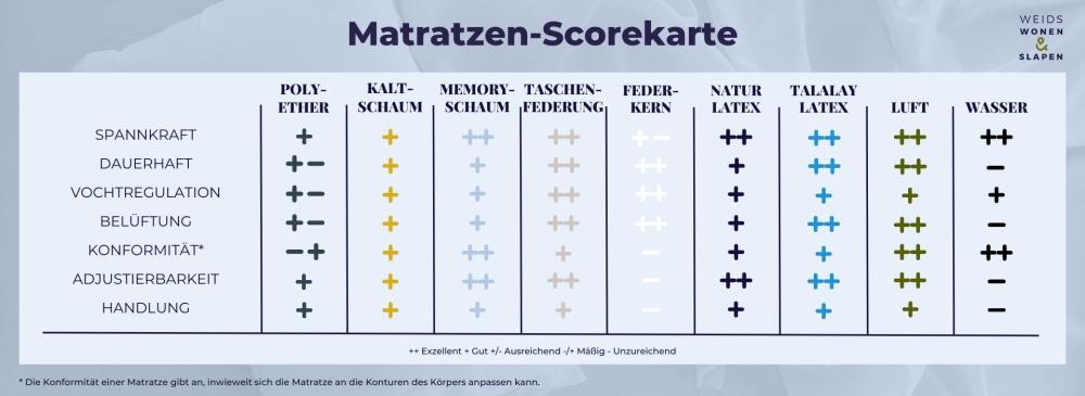 Zusammenfassend haben wir für Sie die Besonderheiten der einzelnen Matratzentypen aufgelistet. Dies finden Sie in unserer Matratzen-Scorecard: