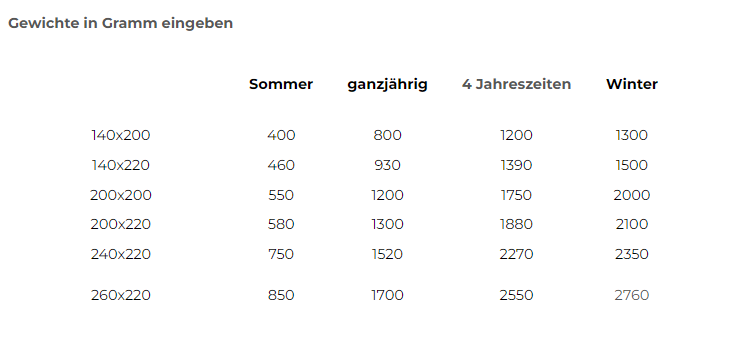 Für den kalten Schläfer oder das kühle Schlafzimmer gibt es die Ganzjahresdecke Sichou. Das Füllgewicht der Ganzjahresdecke ist so abgestimmt, dass Sie ganzjährig bequem darunter schlafen können. Es wird davon ausgegangen, dass die Schlafzimmertemperatur ganzjährig einigermaßen konstant ist und beeinflusst werden kann (Heizung an oder Fenster offen).