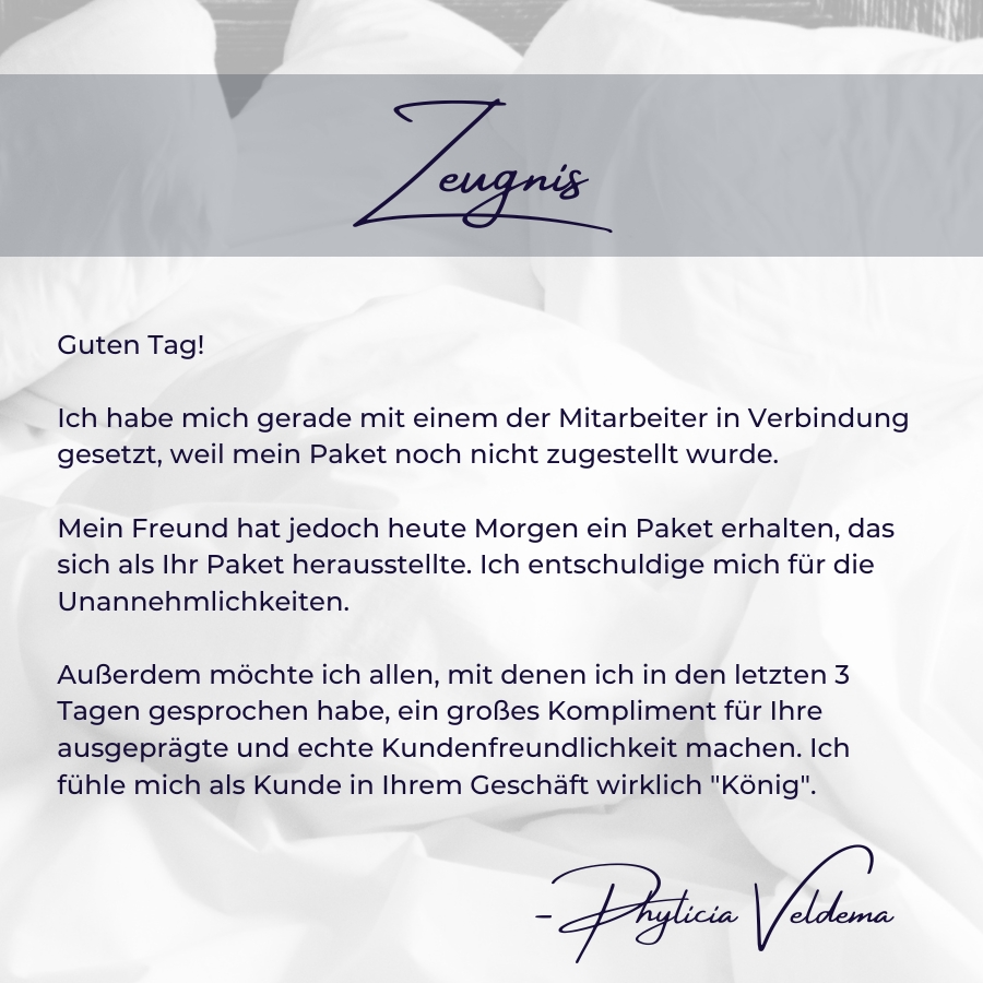 Guter Schlaf wird stark vom Komfort des Materials beeinflusst, auf oder unter dem Sie liegen. Das können wir Ihnen problemlos bereitstellen -:) Faktoren, auf die wir jedoch keinen direkten Einfluss haben, sind beispielsweise Ihr Lebensstil, Ihre Essgewohnheiten und Ihre Gemütsverfassung. Die Gedanken, die dir durch Kopf und Herz gehen! Wo Ihr Bewusstsein angesprochen wird..